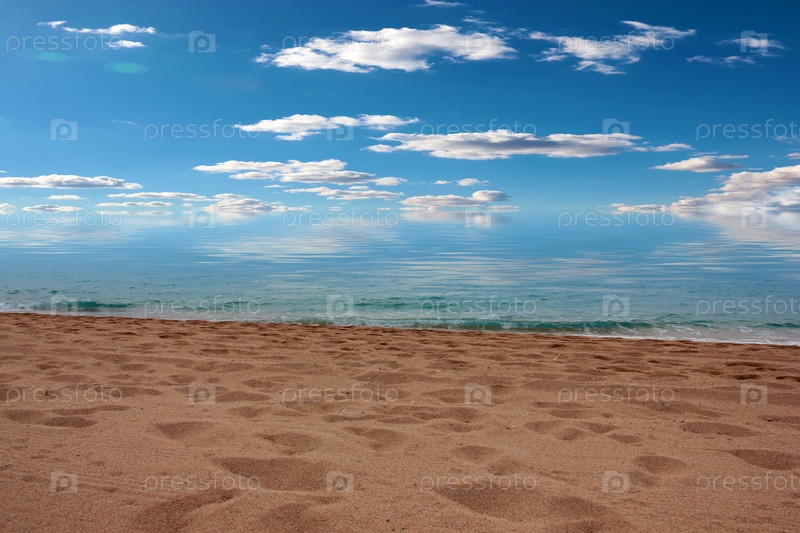 Красивый песчаный пляж и солнечное небо как место для активного отдыха