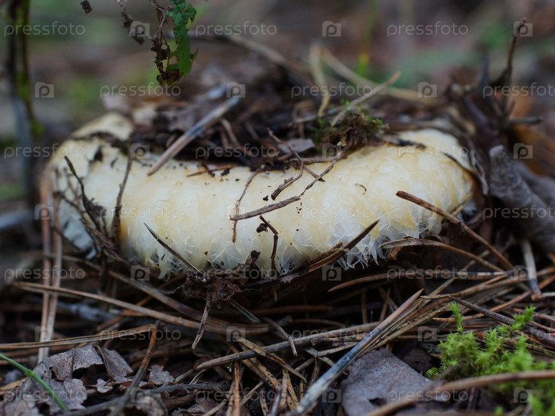 Мохнатый белый груздь под листвой в лесу Ленинграсдкая область