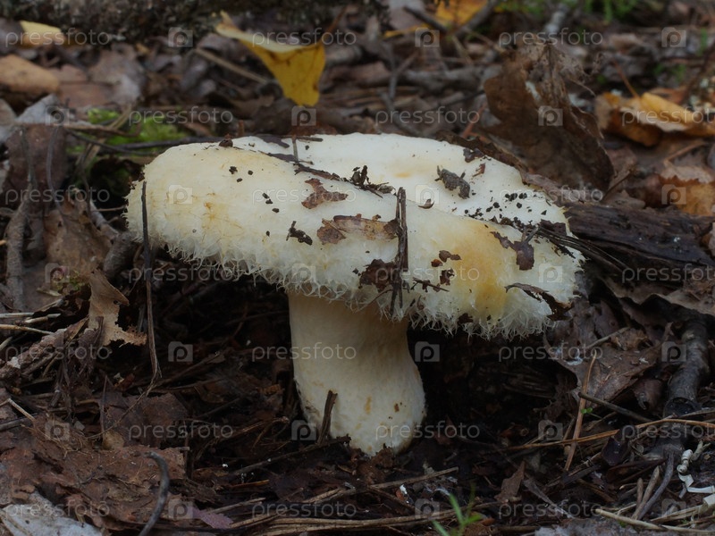 Мохнатый белый груздь под листвой в лесу Ленинграсдкая область