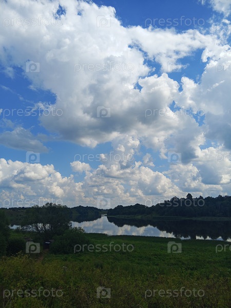 Белые кучевые облака в синем небе река Волхов Ленинградская область