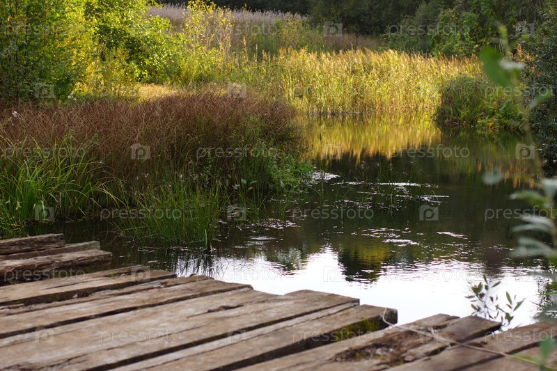 Деревянный мосток на закате через тихую речку Псковская область