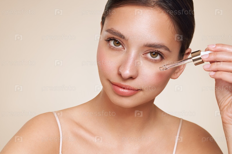 Молодая красивая женщина наносит сыворотку для лица