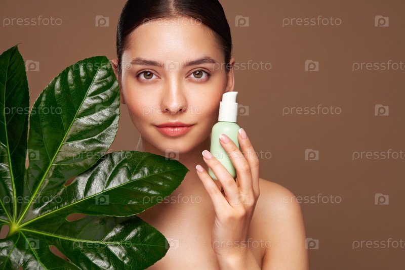 Закройте женское лицо с зеленым экзотическим листом