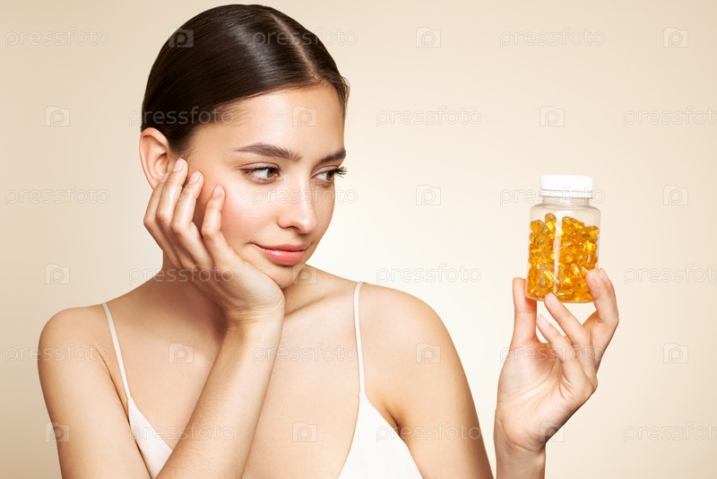 Красивая девушка с таблеткой с маслом печени трески Омега-3