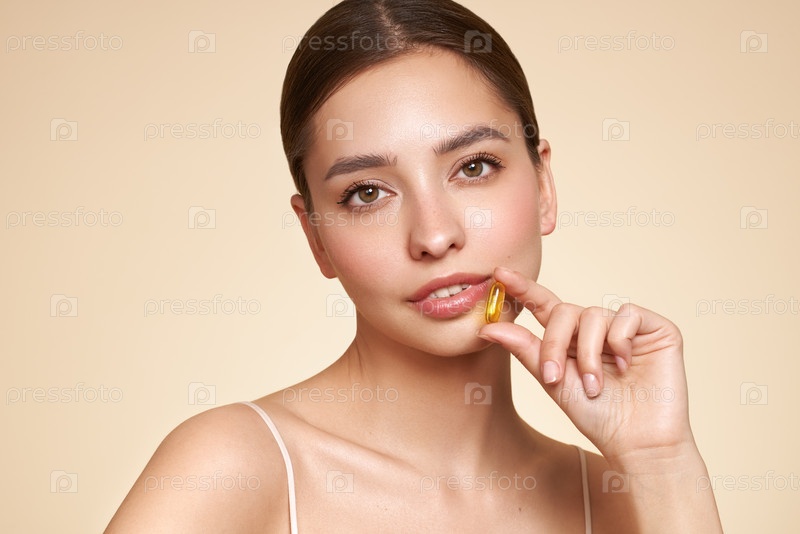 Красивая девушка с таблеткой с маслом печени трески Омега-3