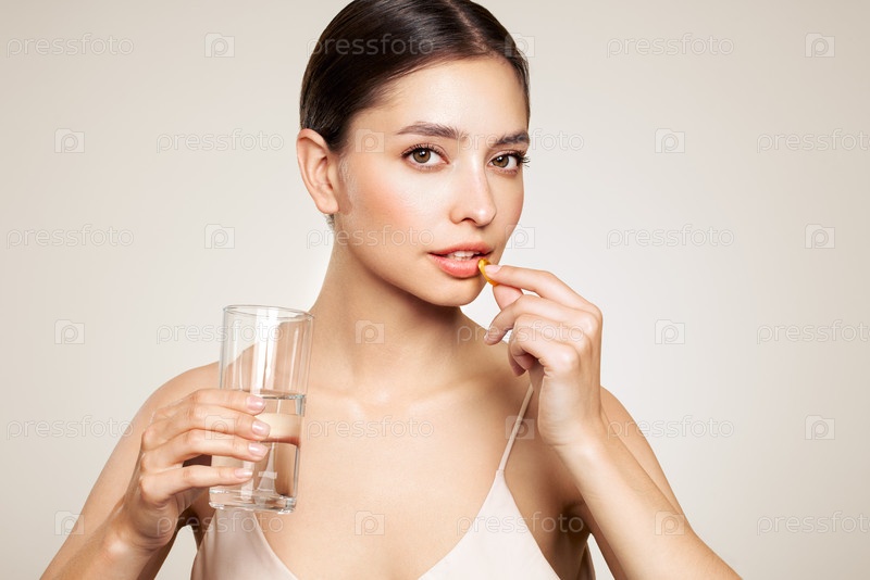 Красивая девушка с таблеткой с маслом печени трески Омега-3