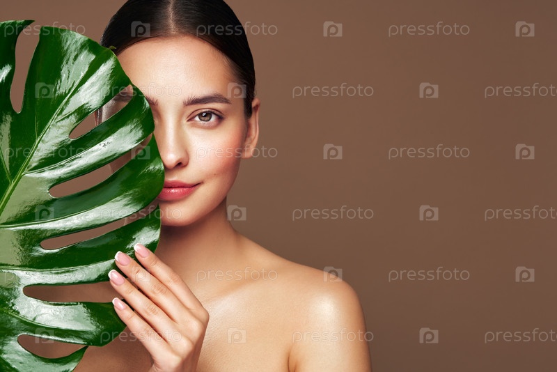 Закройте женское лицо с зеленым экзотическим листом