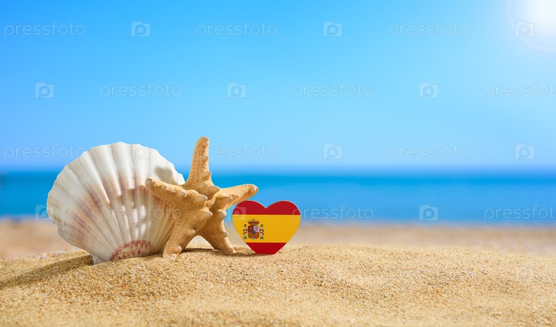 Флаг Испании в форме сердца и ракушки на песчаном пляже