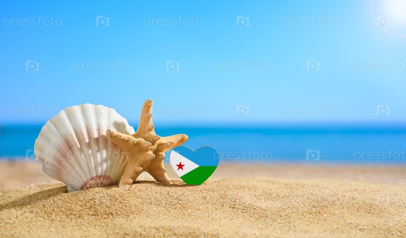Флаг Джибути в форме сердца и ракушки на песчаном пляже