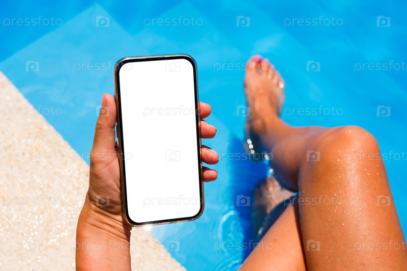 Девушка, держащая телефон у бассейна. Пустой белый экран. Концепция обслуживания в ресторанах и онлайн-бронирования