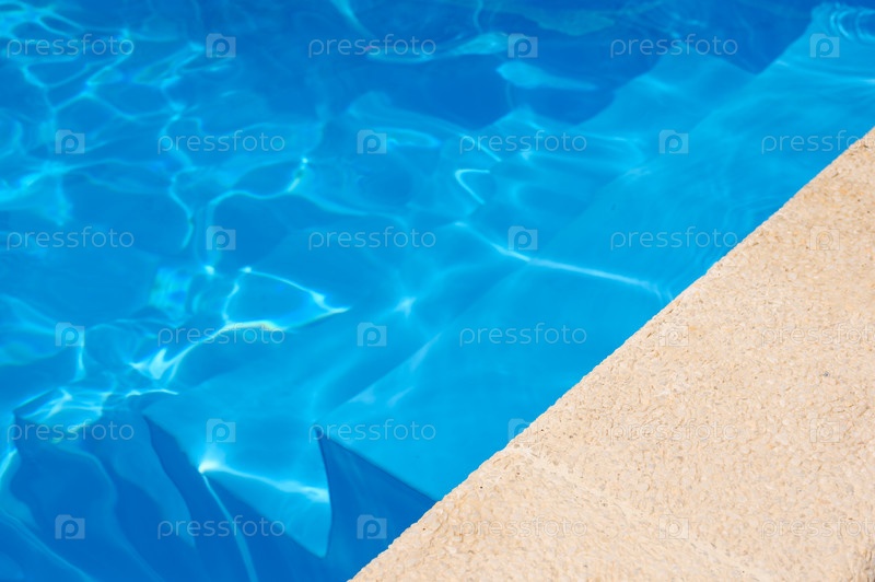 Бассейн летнего отеля. Вход в бассейн. Выборочный фокус не на краю бассейна. Голубая вода на заднем плане