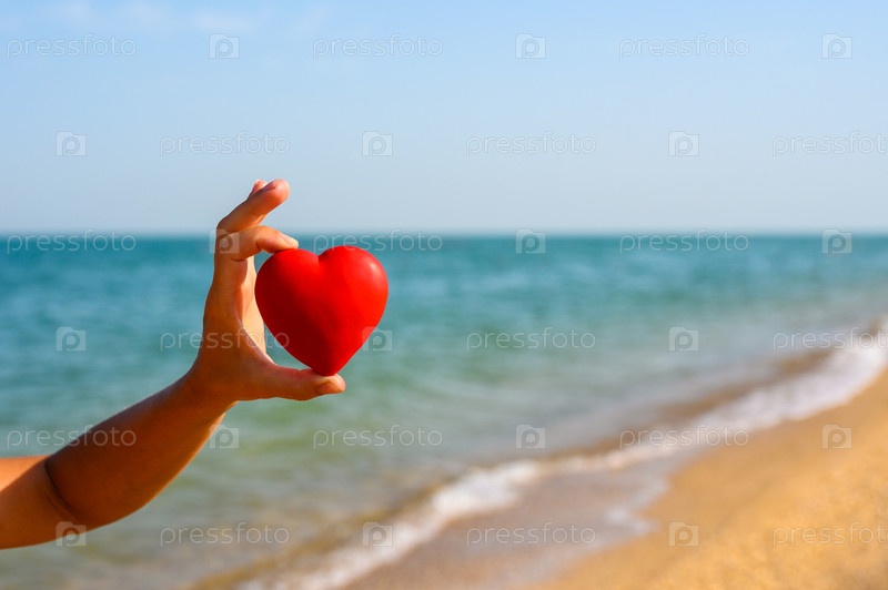 Красное сердце в руке на фоне моря