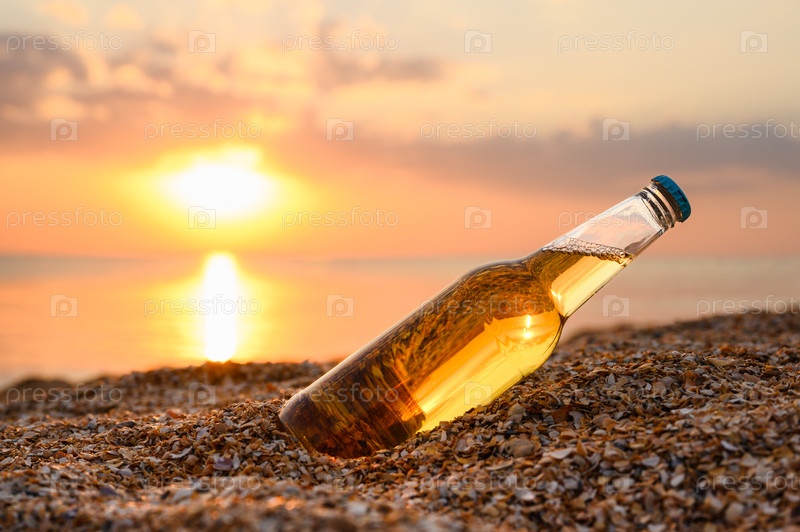 Бутылка пива на пляже, закат на берегу моря и бутылка легкого пива