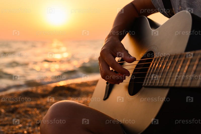 Гитара на пляже при закате солнца, гитаристская рука с гитарой перед вечерним морем. Близкий план, выборочный фокус
