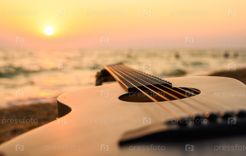 Акустическая гитара на фоне приморского заката. Близкий план, выборочный фокус на струнных инструментах