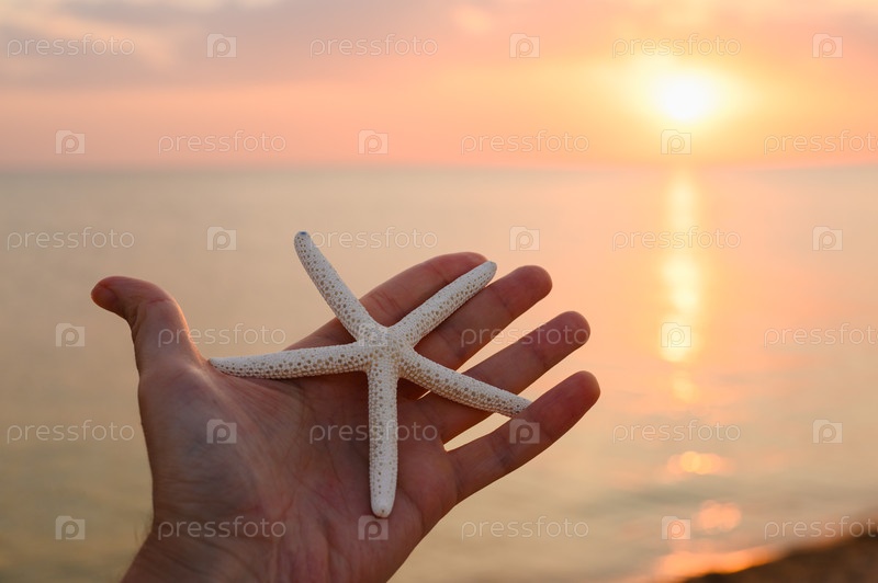 Морская звезда в руке на фоне заката