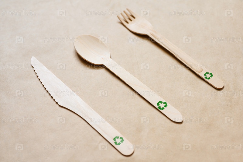 Одноразовые столовые приборы с символом переработки. концепция экологически чистой посуды для туризма. селективный фокус