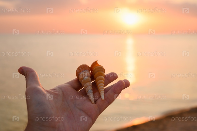 Два раковины в ладони на фоне моря.Концепция экологии и единства с природой