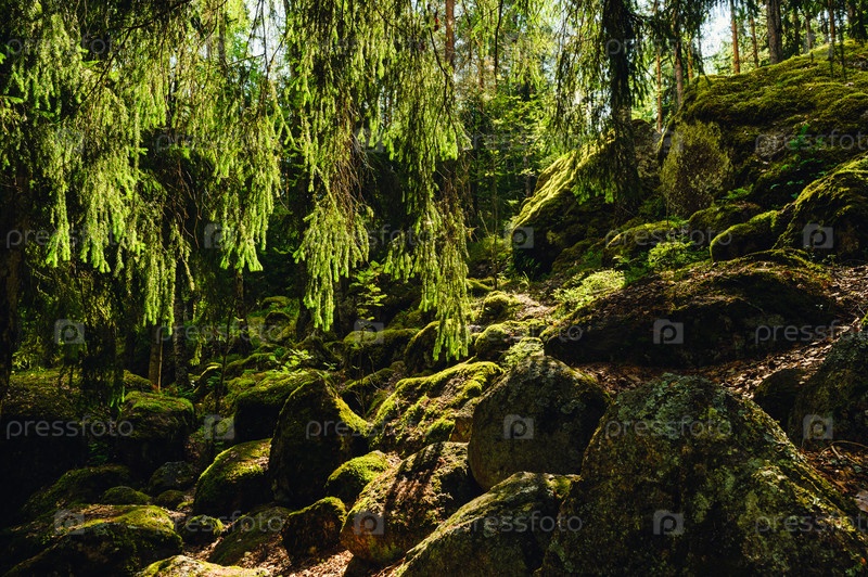 Дикий лес. Большие камни в лесу под волшебным солнечным светом. Лесной пейзаж. Выборочный акцент на камнях
