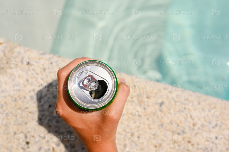 Открытая банка напитка в руке у бассейна Близкий план выпивки в руках Выборочный фокус