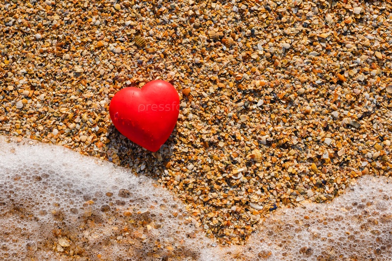 Красное сердце на берегу моря, морская волна и сердце на пляже