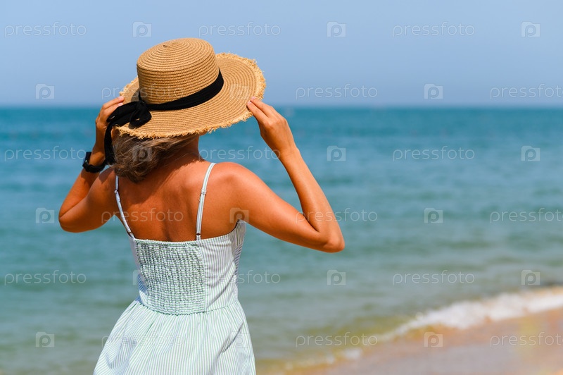 Девочка в соломенной шляпе смотрит на море.Девушка на пляже.Непризнанный человек