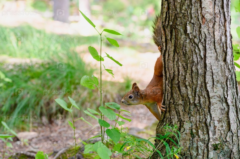 Белка в лесу, белка спускается с дерева, дикая природа и животные