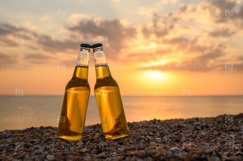 Две бутылки пива на пляже, вечернее море и две бутылки напитка