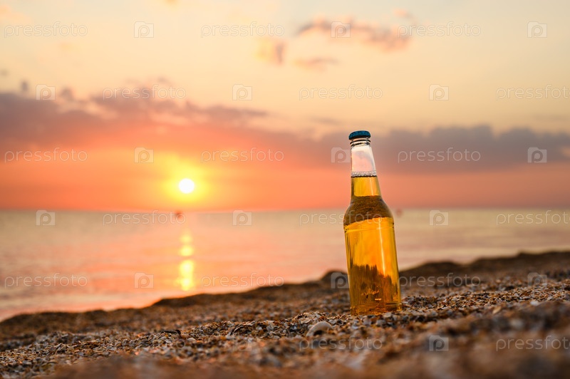 Бутылка на берегу моря, пиво при закате солнца, летние каникулы у моря