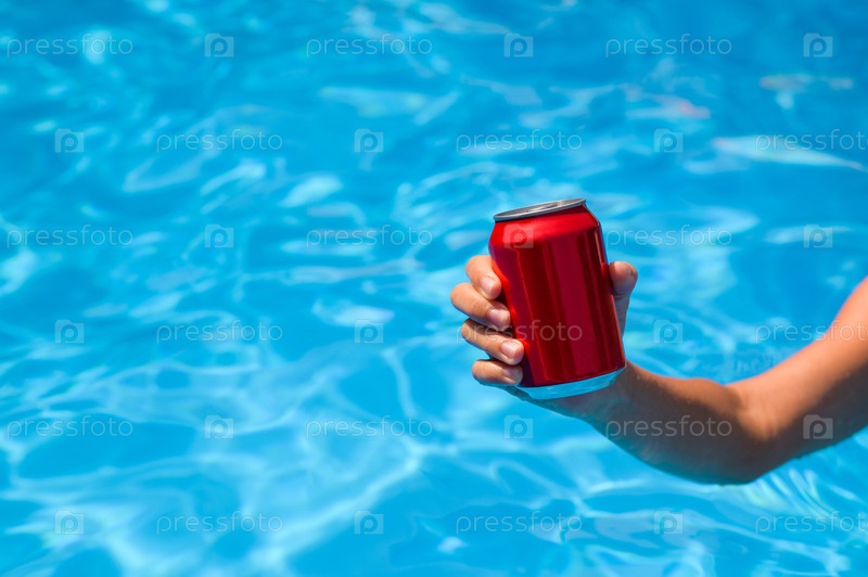 Красная банка холодного напитка в руке у бассейна отеля, освежающий напиток летом