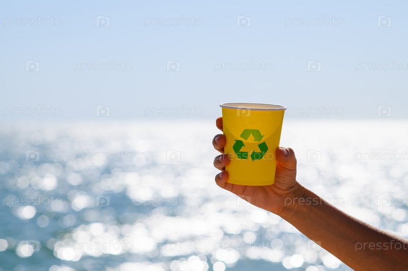 Бумажная чашка с знаком переработки в руке на фоне моря. концепция экотуризма на морских курортах