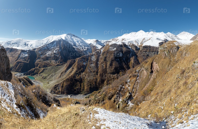 Осенний пейзаж заснеженных кавказских гор и ущелий