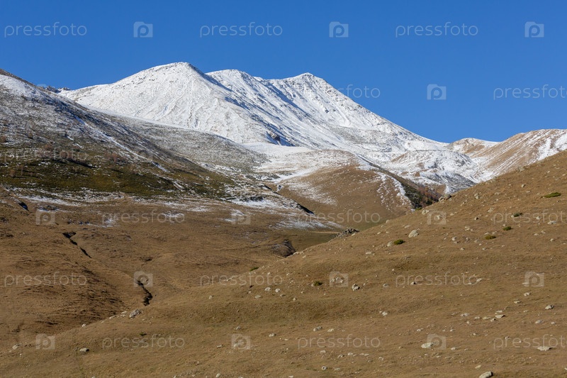 Пейзаж заснеженных вершин главного Кавказского хребта на фоне голубого неба, Грузия. Красивый горный осенний пейзаж в солнечный ясный день. Путешествие по высокогорным районам, открытие дикой природы