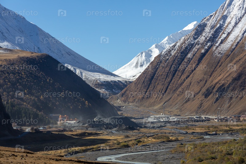 Вид на горную долину, окруженную снежными горами на Кавказе