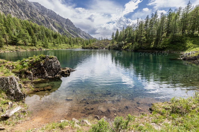 Пейзаж чистого бирюзового горного озера Куектанар в солнечный день на фоне леса лиственницы и скалистых хребтов Алтая.Летняя поездка по дикой сибирской тайге, походы и трекинг на природе