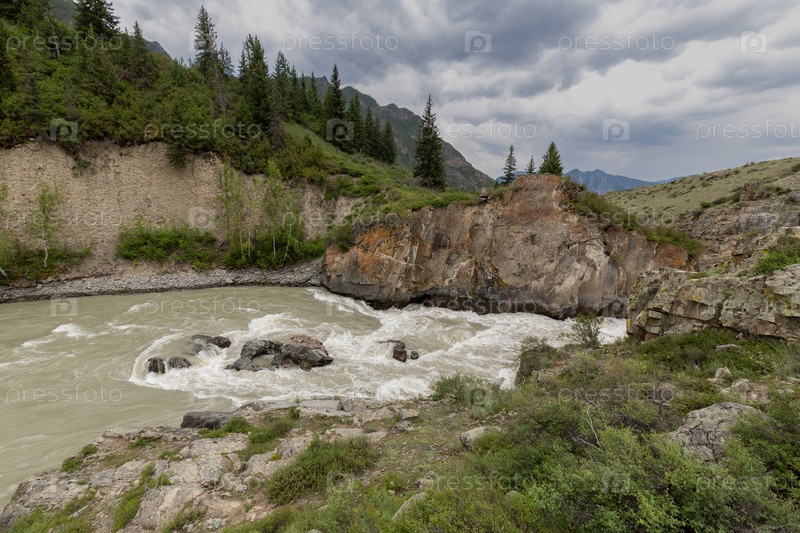 Пейзаж Турбина-Рапидов на реке Чуя в Алтайских горах. Вид на бурную горную реку в пасмурный летний день. Дикая природа путешествует во время отпуска