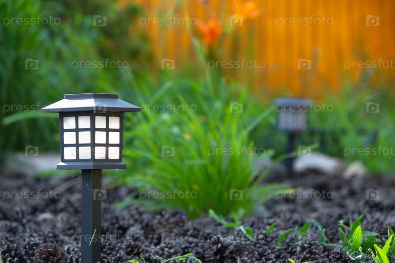 Современный солнечный садовый фонарь, мульча и дневная клумба, декоративные акценты травы, экологически чистый дизайн, современное освещение ночного светодиодного пути, многолетняя комбинация