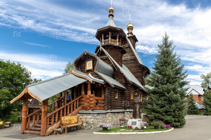 Старое деревянное здание церкви Святого Макария Русской Православной Церкви в Горно-Алтайске в солнечный летний день, город в Западной Сибири, Россия, путешествие по Республике Алтай