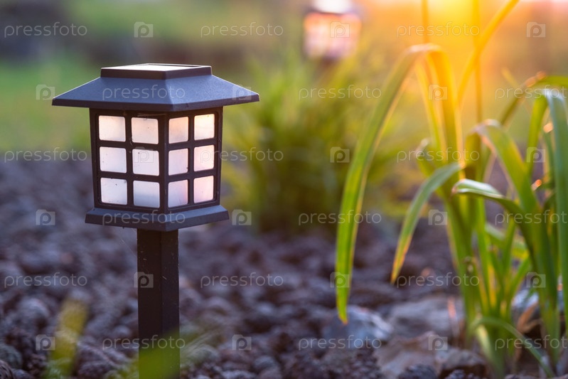 Светодиодная солнечная садовая лампа в многолетнем клумбе, мульчированный, современный ландшафт, декоративные травы микс, экологически чистое освещение тропы, стильная композиция
