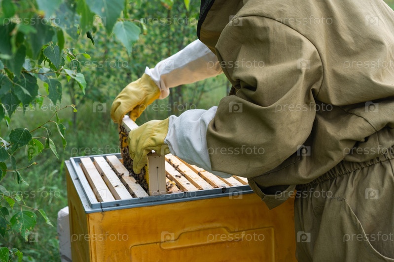 Удаление рамы для меда, пчелы в пасеке, инспекция размножения, костюм для пчеловодства, мед из улья, органическое сельское хозяйство, естественный сосуд, уход за колониями пчел, опыление