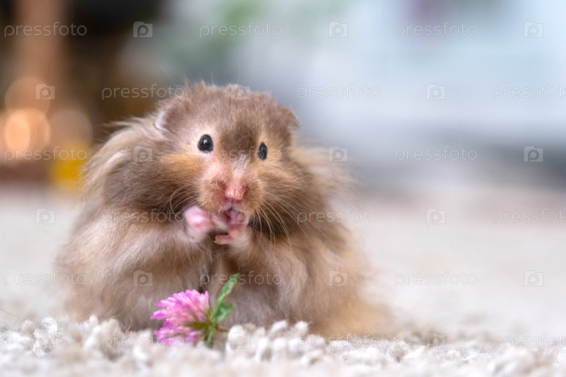 Сирийский хомяк, держащий цветок, мягкая пушистая шерсть, длинные волосы, вегетарианская закуска, прирученный питомец, нежный семейный грызун, любимое для детей, образовательное, использование в зоопарке