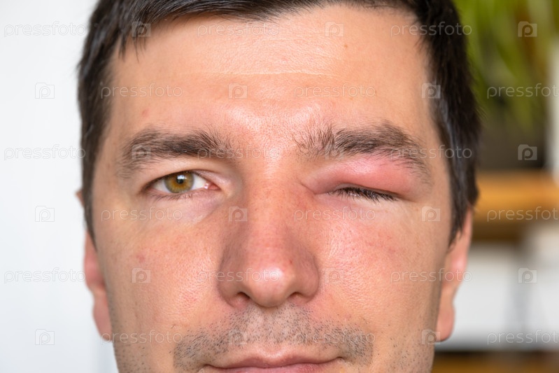 Опухшие веки после укуса насекомого (пчелы), аллергия, сильное покраснение, боль и риск серьезных последствий; возможные причины включают травму, конъюнктивит, инфекцию