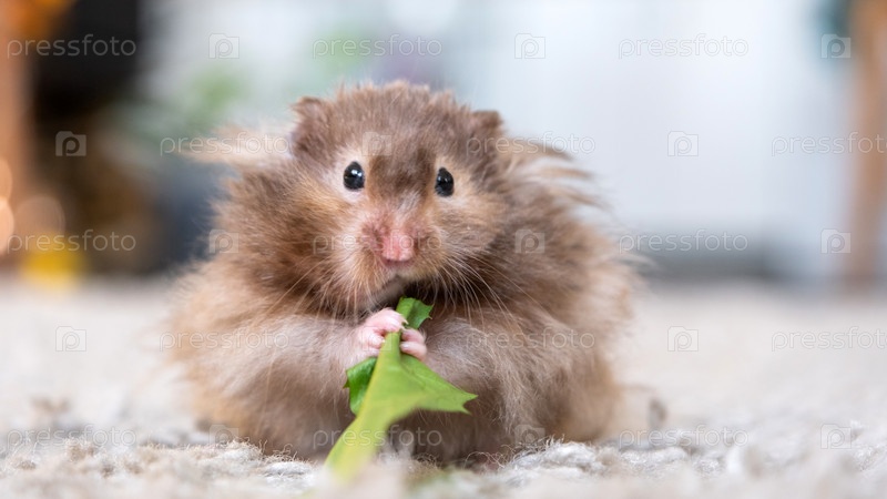 Сирийский хомяк грызет листья, длинные волосы, пушистый питомец, мелкие грызуны, домашнее животное, безопасный детский питомец, дом, диета включает свежие овощи, обучение животным