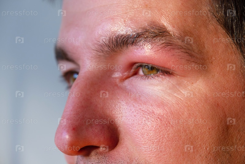 Аллергическое отечение глаз после укуса пчелы, покраснение век, сильное опухоливание, опасность инфекции, срочная помощь необходима, другие причины включают травму и конъюнктивит