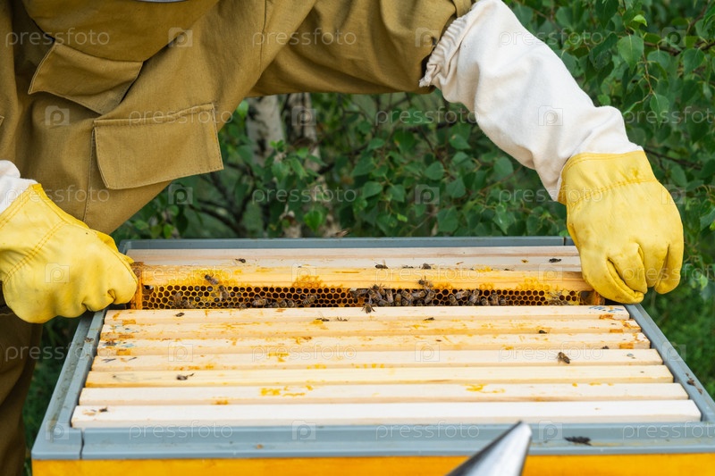 Ориентировочный осмотр с видимым медом, пчеловод внимательно наблюдает за пчелами на гребне, ближайшие клетки размножения, контроль качества, ручной уход, здоровая колония