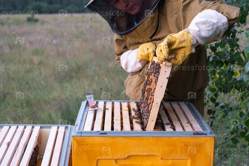 Пчеловод, извлекающий медную раму, крупный план пчел на чешуе с крышкой, ручная проверка качества, подробная уборка меда, органический медоносник, сельское пчеловодство
