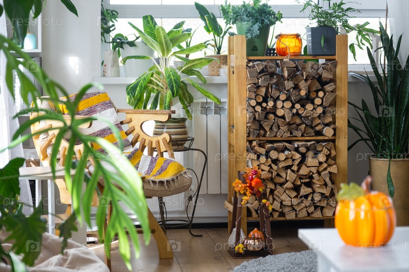 Осенняя деревенская гостиная, эко-дизайн, комнатные растения в горшке, хранение бревна, тыквенный декор, теплые деревянные материалы, естественный комфорт, ориентация на устойчивость