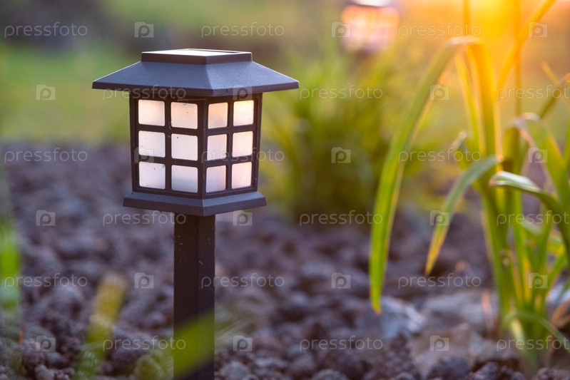 Солнечный фонарь, современная цветовая оборона с мульчой и декоративной травой, многолетний эко садовый акцент, современное наружное освещение, ночная атмосфера