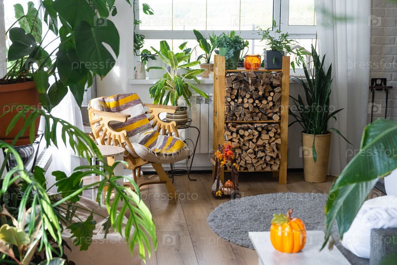 Жилое пространство деревенского дома, экологически чистый деревянный декор, зеленые растения в помещении, осенняя атмосфера, тыквенный акцент, рустичный и устойчивый интерьер, вдохновленный природой
