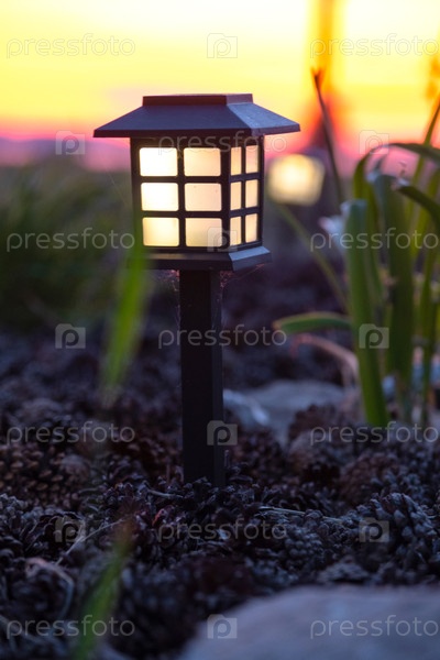 Декоративный солнечный садовый фонарь в клумбе, смешанные многолетние растения и декоративные травы, современный устойчивый ландшафтный дизайн, мягкая мульча